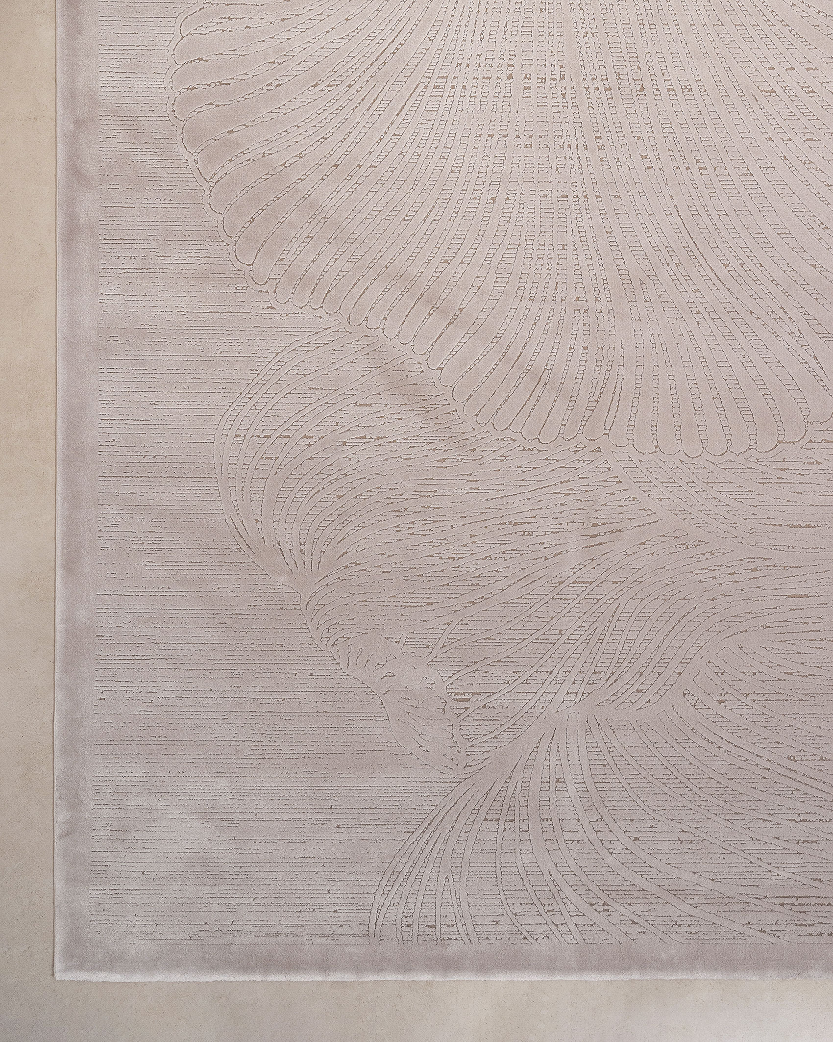 This rug features a light color combination, predominantly light gray and cream, with beige borders. At first glance, the design appears simple with faded edges, but upon closer inspection, intricate and delicate details emerge. One side of the rug has a shiny and smooth finish, giving it a bright appearance, while the other side has a matte finish in light gray.