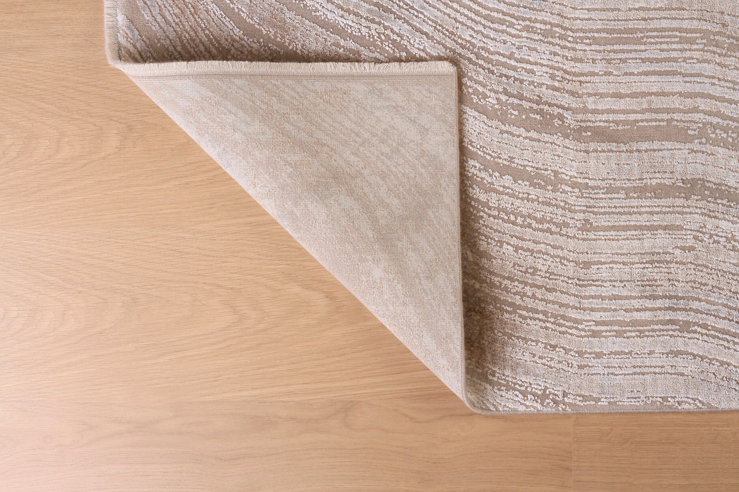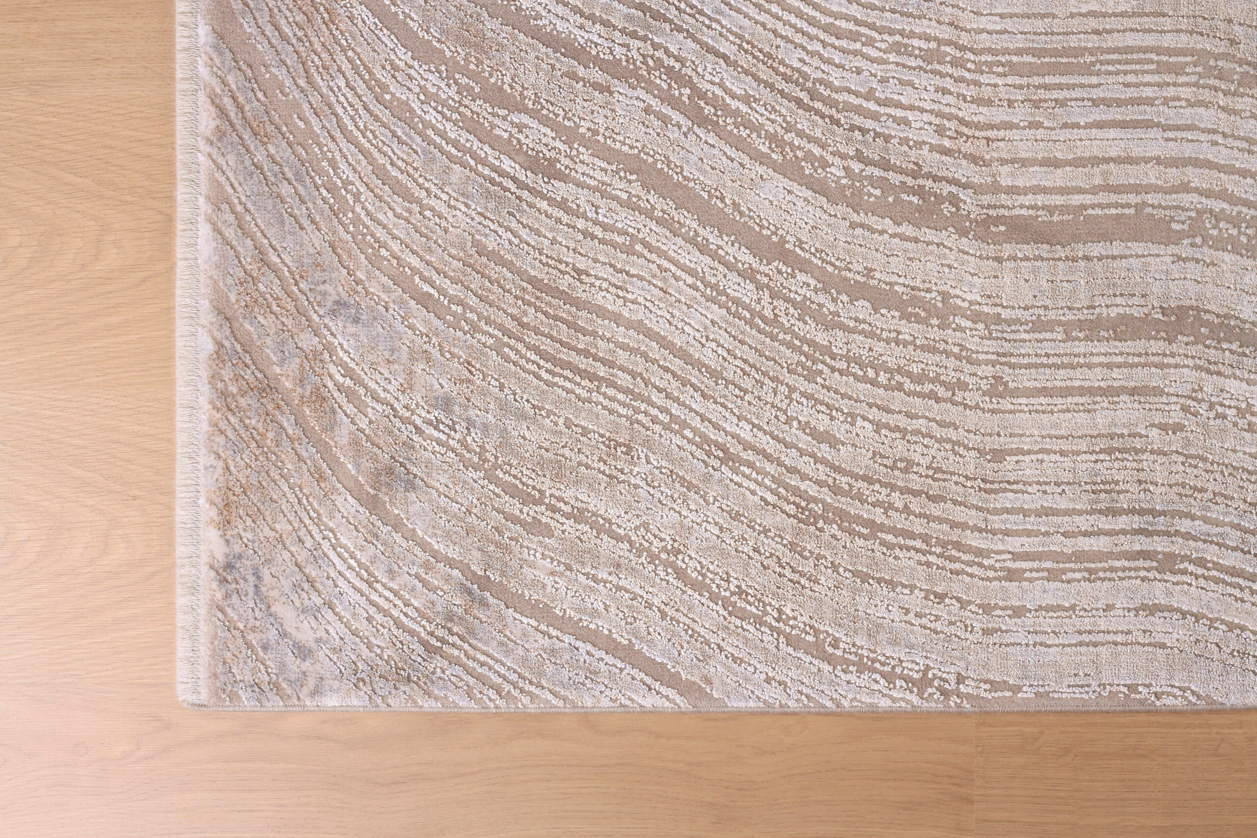 Ovaj tepih sadrži kombinaciju bež, krem i različitih nijansi sive, stvarajući harmonizovanu paletu boja. Dizajn uključuje sjajne delove koji podsećaju na krivudave linije nacrtane velikom četkom, dodajući umetnički i jedinstven pečat. Ovaj tepih se izdvaja kao umetničko delo, a ne samo običan tepih.